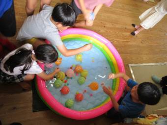 『ヨーヨー釣り』好きな色の風船をみんな慎重に吊り上げていました。