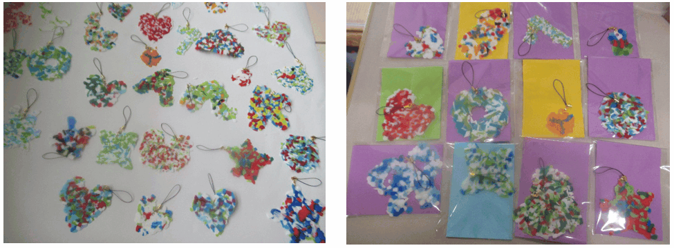 『ペットボトルキーホルダー作り』ペットボトルの蓋を小さく切って自分が好きな形を作って、アイロンでぎゅ~っと押してキーホルダーを作りました!