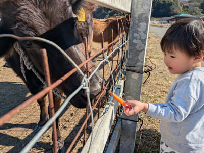 エサやりでは、自分よりも大きい動物を目の前にして少し怖がる子ども達。お友達がウマさんにエサをあげている姿を見て、「やってみよう!」と手を伸ばして挑戦することができました!!